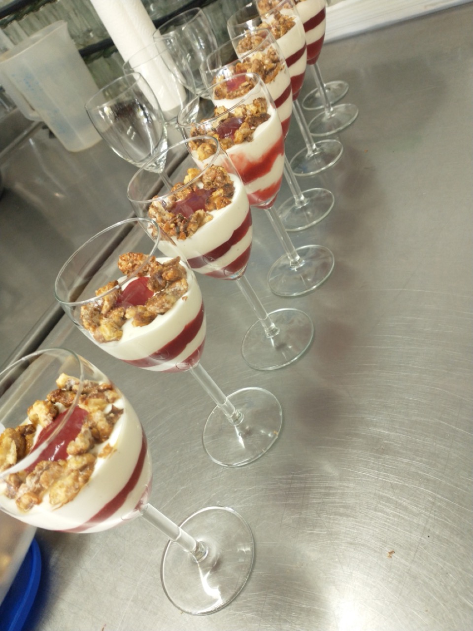 Nachspeise: Quark mit einer unserer Marmeladen und Keksen und karamelisierten Nüssen